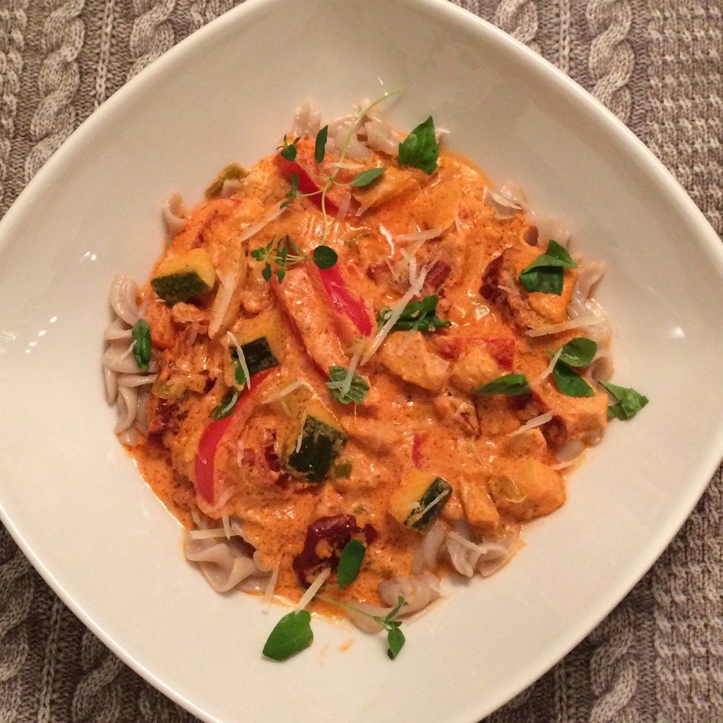 Kok pastaen som anvist på pakken. Del paprikaen i tynne strimler, del vårløk, squash og soltørkede tomater i biter. Jeg bruker soltørkede tomater som er på glass i olje. Jeg bruker å ha de soltørkede tomatene i et dørslag og skylle dem i vann for å få bort oljen. Ellers kan det bli litt mye olje i retten. Del kyllingfiletene i biter og stek dem nesten ferdig i en stor panne. Krydre med salt og pepper. Tilsett grønnsakene, soltørkede tomater og ingefæren og stek dem et par minutter. Tilsett så limesaften og pastavannet, matfløte, vann og tomatpure. La det putre i ca 5 minutter. . Velbekomme!